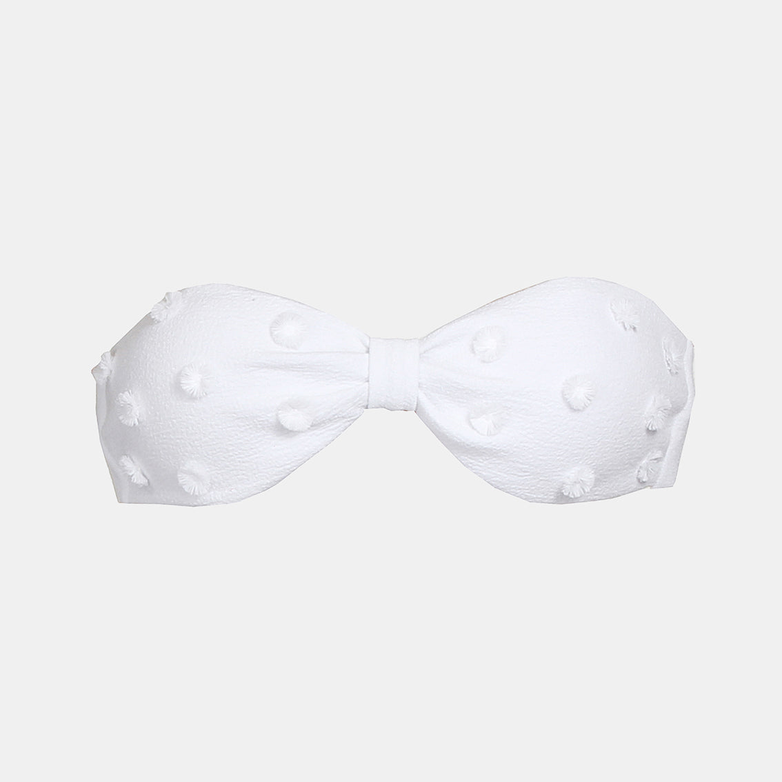 - Our Amanda Bandeau Bikini top is effortless and easy-to-wear. Made with our signature bouclé with elastane fabric appliquéd the much loved handcrafted pompons